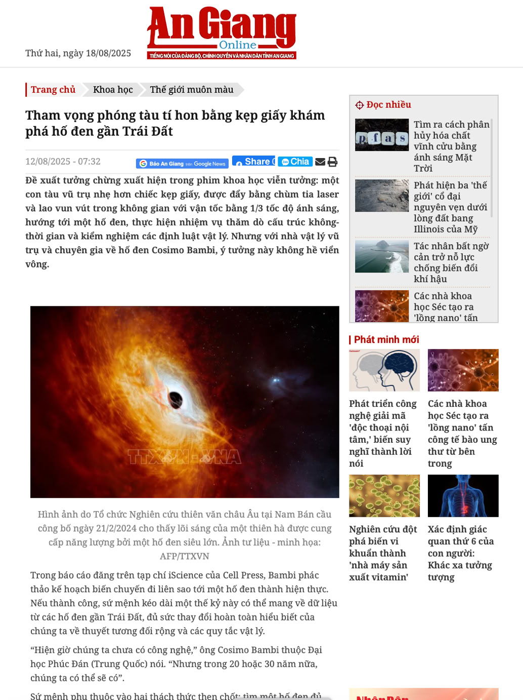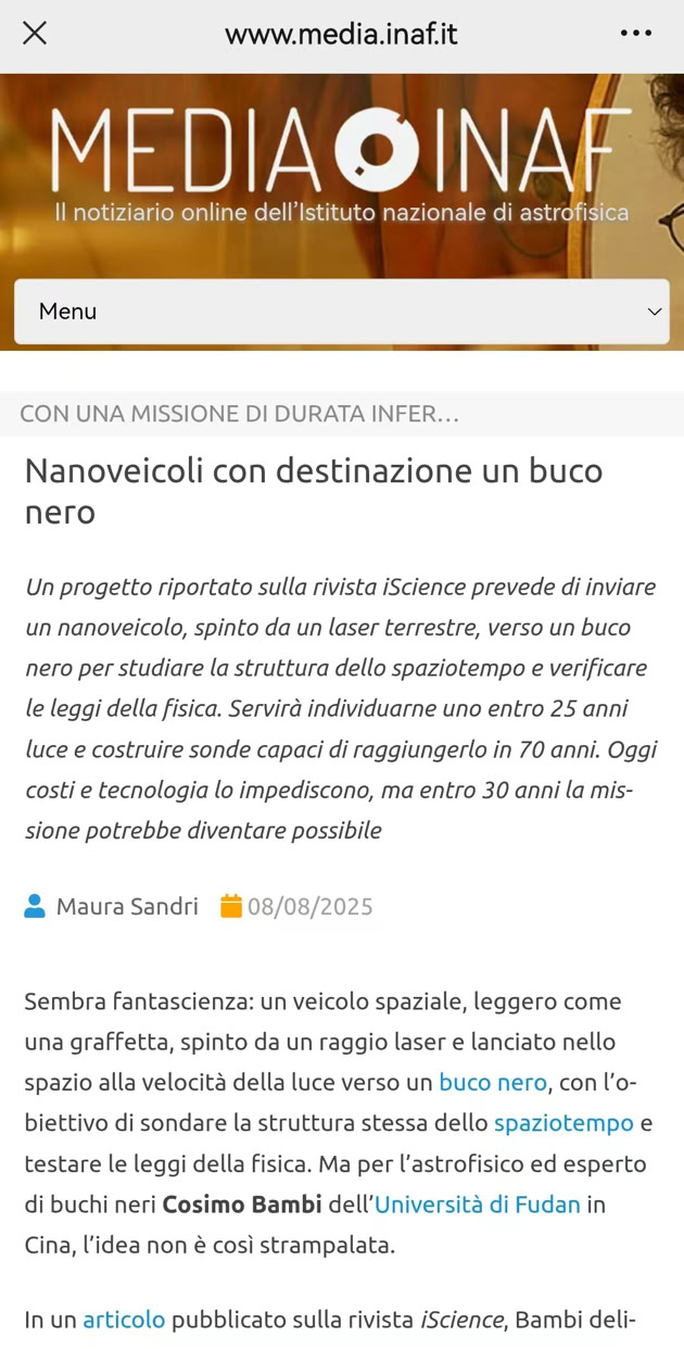 A nanocraft is a gram-scale spacecraft comprising two main parts: a gram-scale wafer and a light sail (see figure below). The gram-scale wafer is the main body of the spacecraft and constitutes a fully functional space probe with a computer processor, solar panels, navigation and communication equipment, etc. The light sail is an extremely thin, meter-scale, dielectric metamaterial. Ground-based high-power lasers can accelerate the nanocraft by pushing the light sail with their beams. With this method, the nanocraft can reach a velocity of some fractions of the speed of light. If the black hole is at 20 light years from the Solar System and the nanocraft can travel at 1/3 of the speed of light, the nanocraft can reach the black hole in 60 years, run a number of scientific experiments, and send all data to us. The mission would last around 80 years, but we would be able to obtain very valuable information about black holes and General Relativity that might be difficult to obtain in other ways.