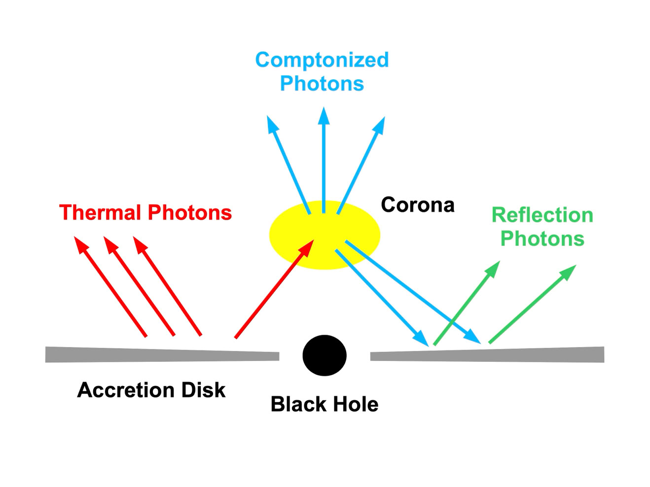 We are interested in the astrophysical system shown in the cartoon below. The black hole can be either a stellar-mass black hole in an X-ray binary or a supermassive black hole in an active galactic nucleus. The crucial ingredient is that the black hole is accreting from a cold, geometrically-thin, and opticaly-thick disk. The thermal spectrum of the disk is normally peaked in the soft X-ray band (0.1-10 keV) in the case of stellar-mass black holes in X-ray binaries and in the UV band (1-100 eV) in the case of supermassive black holes in active galactic nuclei. The corona is some hot plasma (~100 keV) near the black hole and the inner part of the accretion disk. The corona may be the atmosphere above the accretion disk, the base of a jet, the material in the plunging region between the inner edge of the disk and the black hole, etc. Since the disk is "cold" and the corona is "hot", thermal photons from the disk can inverse Compton scatter off free electrons in the corona. A fraction of the Comptonized photons can illuminate the accretion disk: here we have Compton scattering and absorption followed by fluorescent emission, and they produce the reflection spectrum.